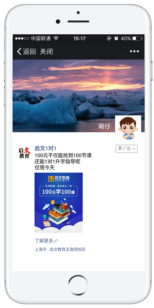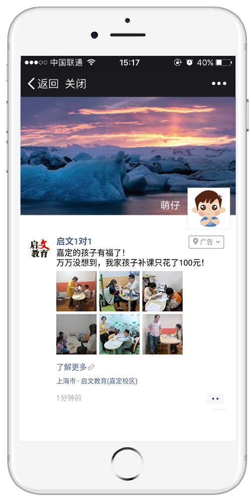 在不断完善服务的基础上,启文教育开发1V1和1V3的授课方式,并在上海地区首先推出“2+1”授课法,课上两小时讲透知识点,课下一小时吃透重难点,让专业的教学质量和口碑“植根”在学生和家长的心中。家长们再通过朋友圈广告的点赞、转发功能,凭借社交力量和口碑效应,吸引更多用户报名课程。
