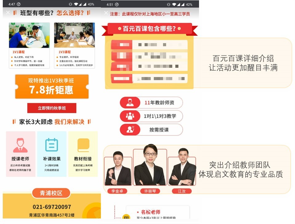 活动详情下面罗列启文教育的优势,突出介绍教师团队,用精良的师资团队,专业的教育品质打动目标客群。