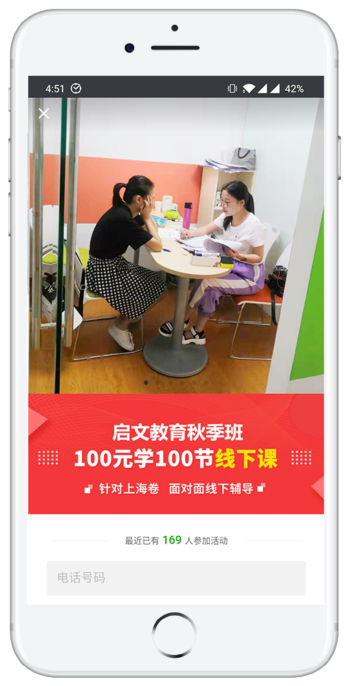 表单栏设置加上了“XX人已预约活动”,加快用户的行动,提高落地页的转化率。Banner下方突出优惠信息,紧跟表单,详细介绍百元百课的课程细节,让家长加深了解,提升转化。