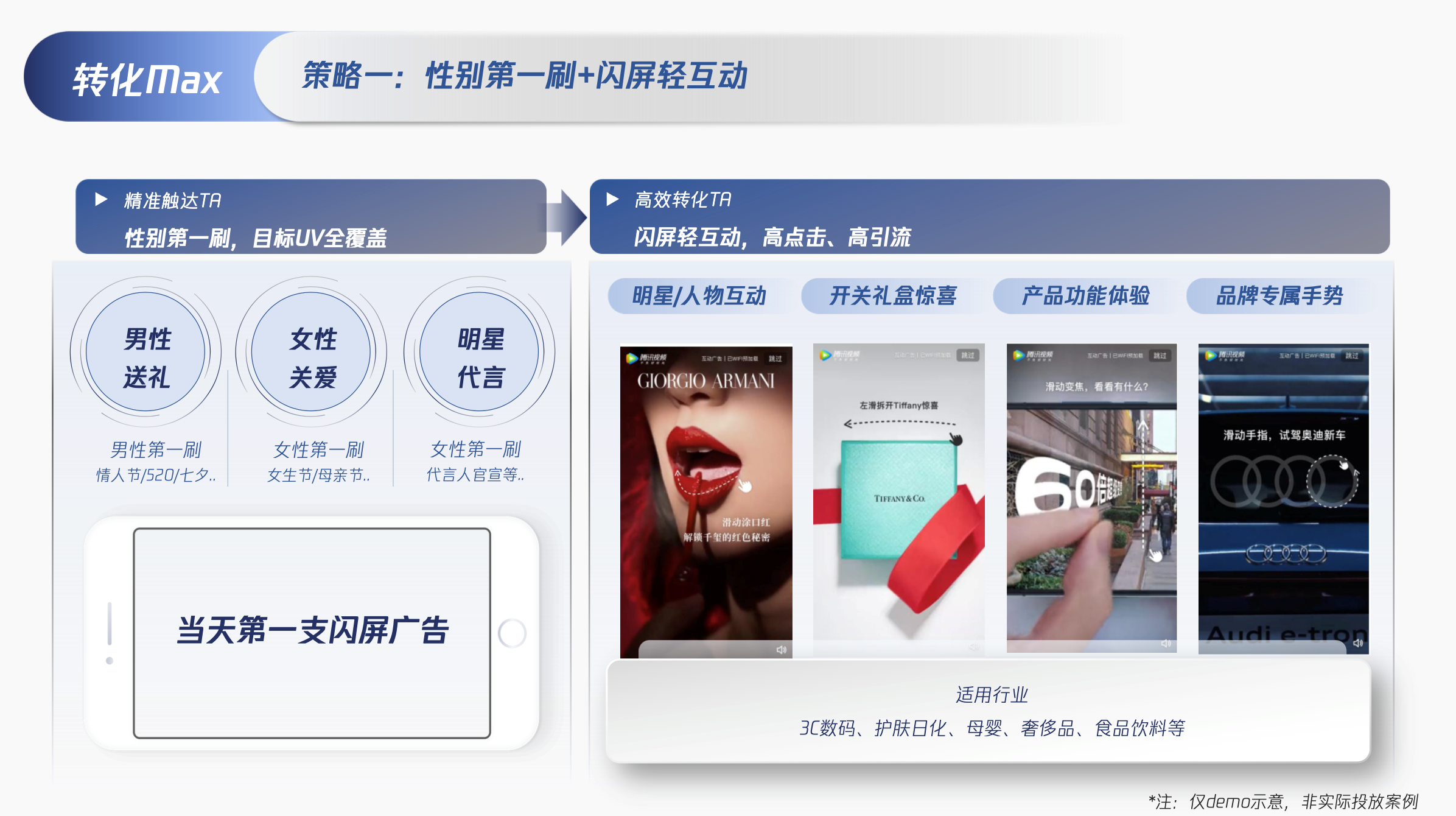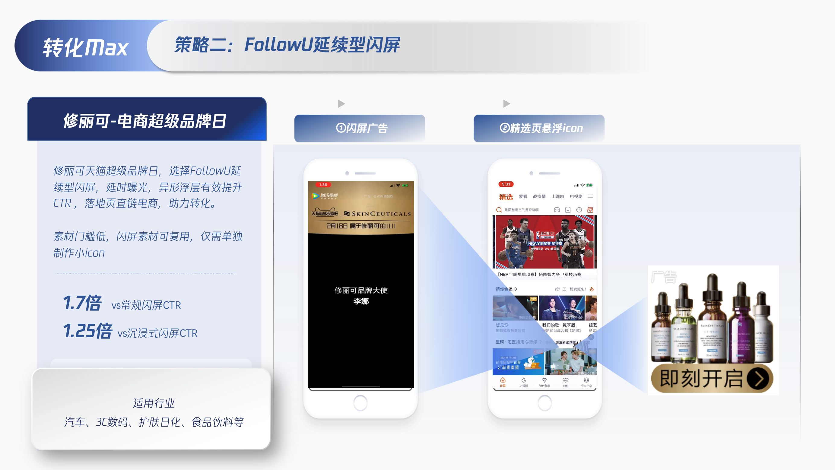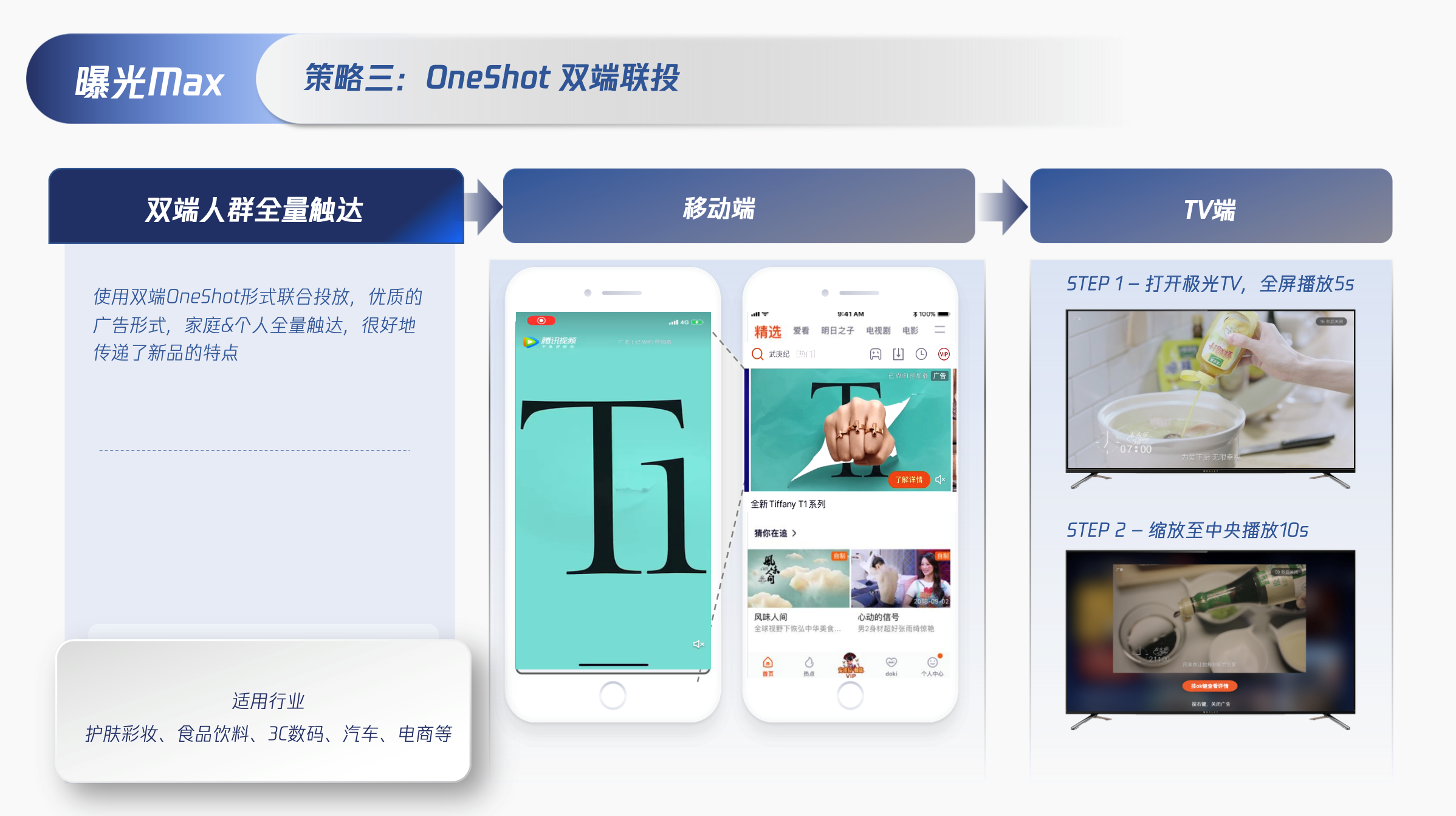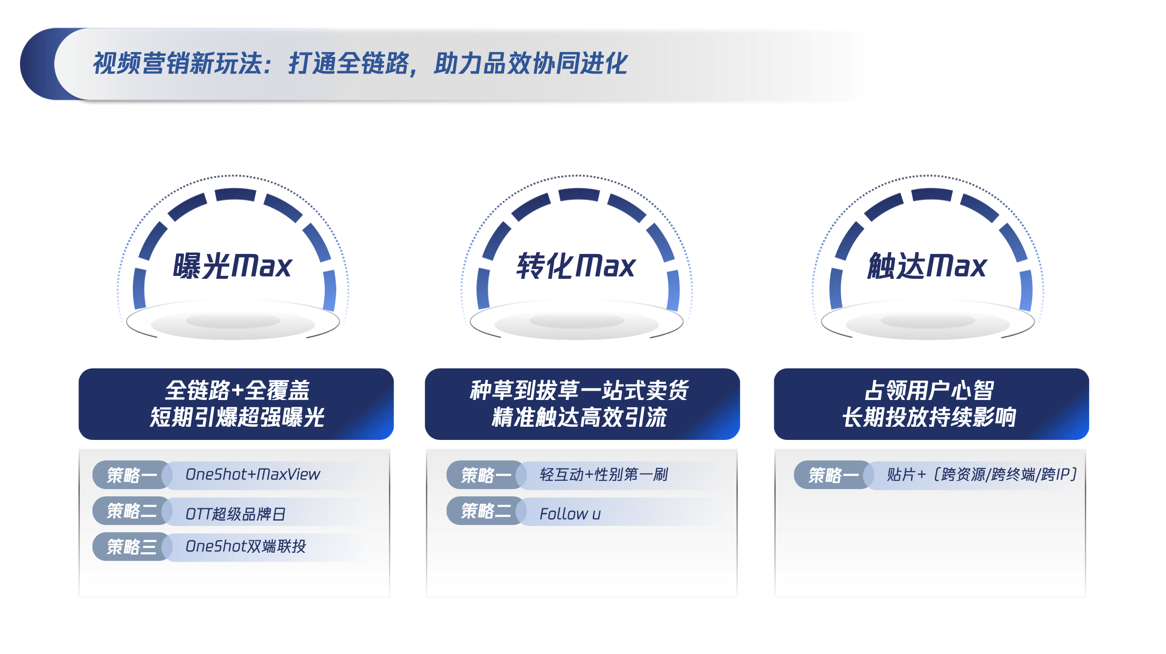 策略一:「OneShot联动式闪屏+MaxView沉浸式贴片」,强曝光+强引流,覆盖移动用户关键路径。