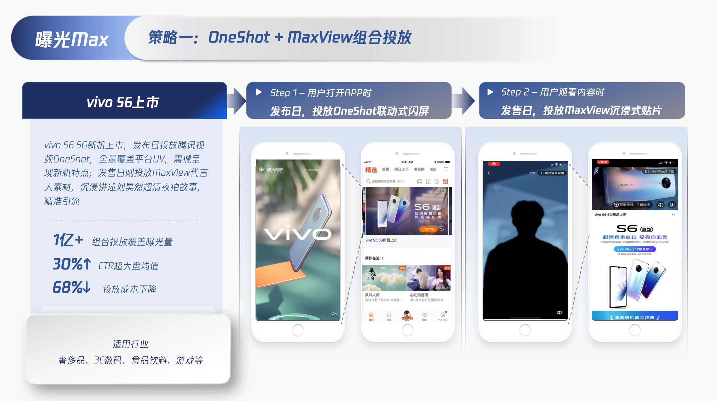 vivo S6通过「OneShot联动式闪屏+MaxView沉浸式贴片」组合投放,获得1亿+曝光。