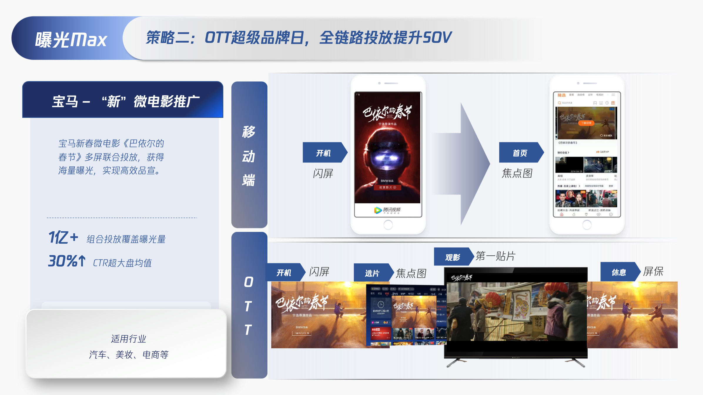 宝马在春节期间,通过「移动端+OTT超级品牌日」全链路投放,为其新春微电影《巴依尔的春节》获得亿级海量曝光,CTR超大盘均值30%。