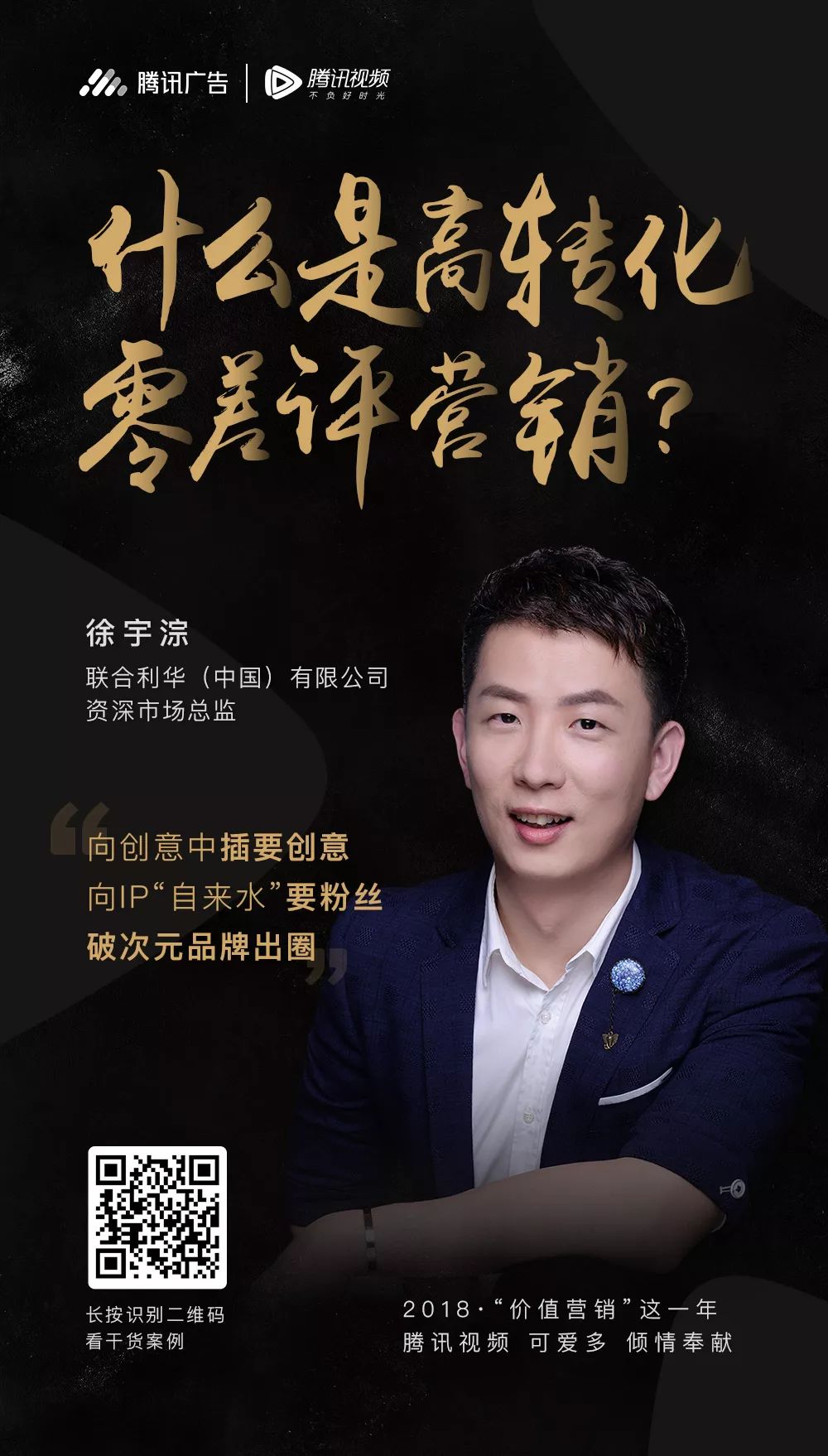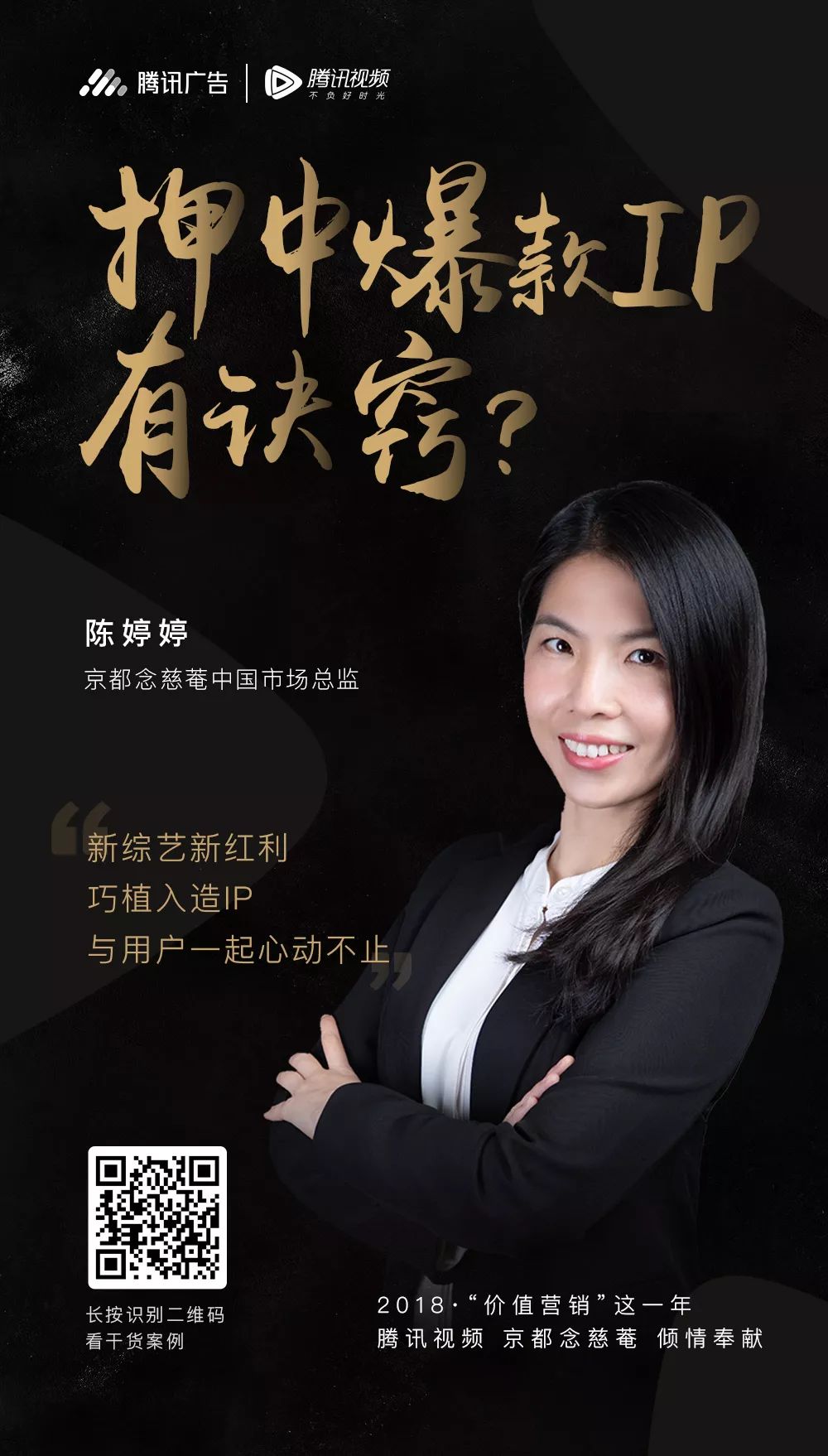 从中华牙膏助力粉丝pick《创造101》小姐姐成为代言人,到唯品会与《扶摇》多触点全链条合作让喜好度飙升,再到《魔道祖师》和可爱多的“零差评”营销,腾讯视频梳理了2018年15个“价值营销”经典案例,并邀请一线品牌CMO、营销总监,揭秘大剧、综艺、动漫、纪录片等精品IP的营销新姿势。