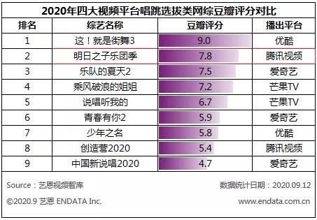 (3)口碑:2020年四大视频平台上线的9档唱跳选拔类网综中,截至9月12日,《明日之子乐团季》位列第二,在第四季节目内容与形式全面升级的语境下,用户口碑再上新台阶。