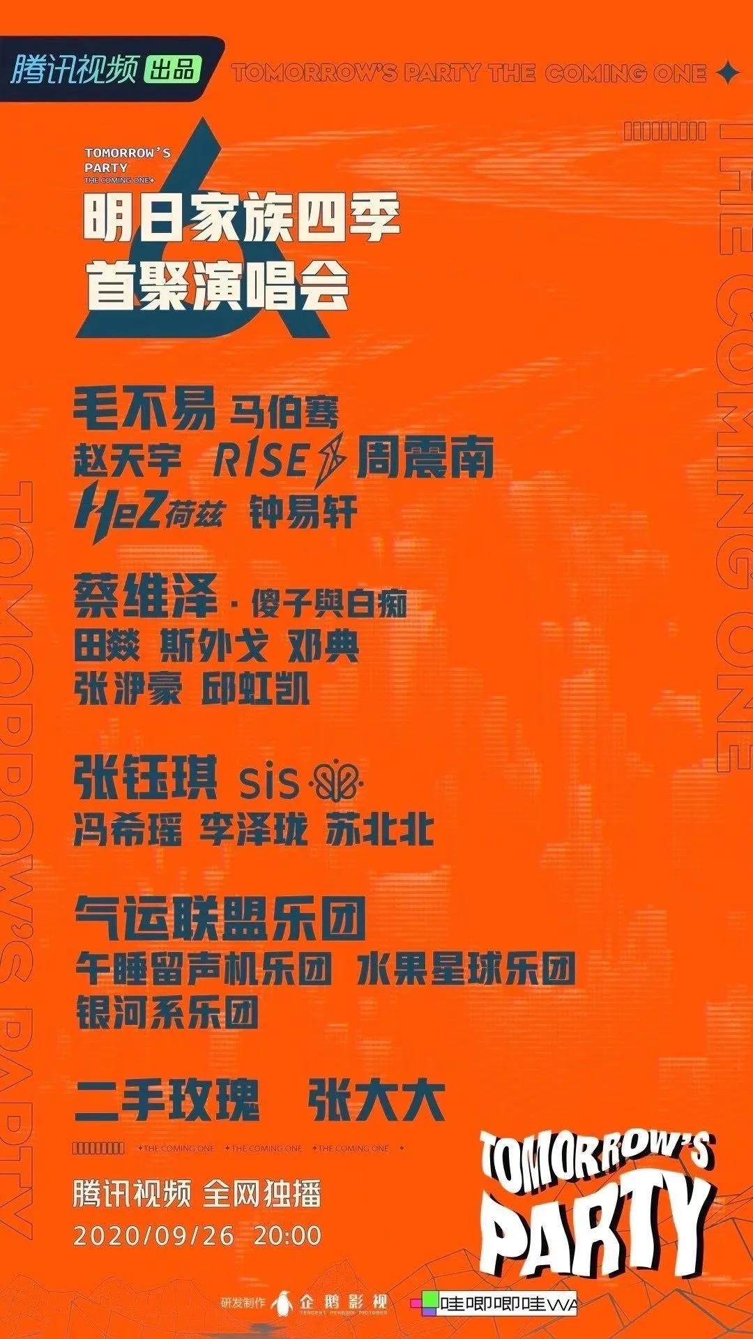 今日,TOMORROW’S PARTY明日之子四季首聚演唱会超强阵容正式揭晓,毛不易、R1SE周震南、蔡维泽、张钰琪、sis组合、气运联盟乐队等四季“明日家族”热门选手将迎来首聚,带来一次独一无二的音乐狂欢盛宴。学弟和学长学姐们共同重返“盛夏”,在明日舞台创造新的回忆。9月26日20:00,明日之子四季首聚演唱会将在腾讯视频全网独播。