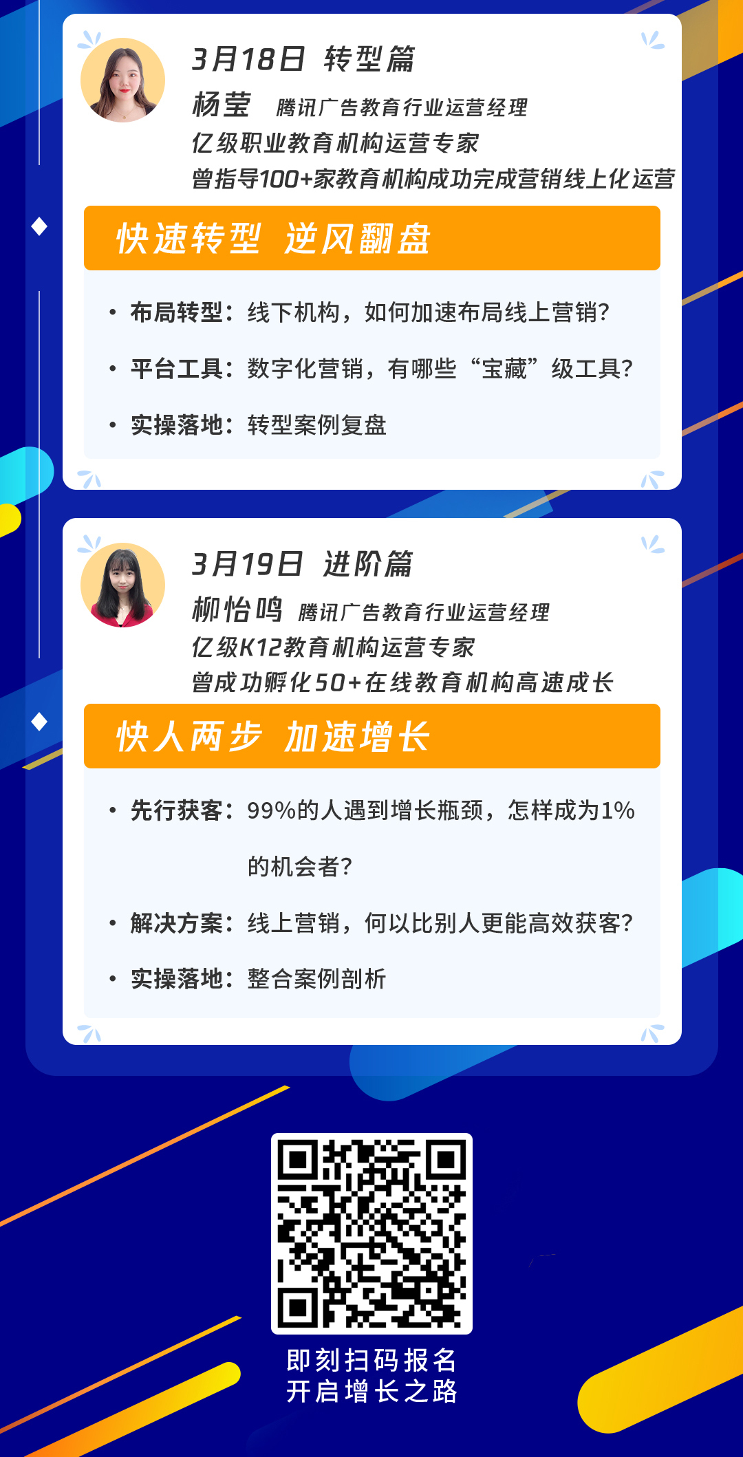 本系列课程专为各线下线上教培机构发展核心决策人、市场总监及营销负责人定制打造。如果您期望尽快通过线上获客带来实在业务增长同时降低营销成本,查看下图扫码,或点击文末“阅读原文”,即可快速报名!