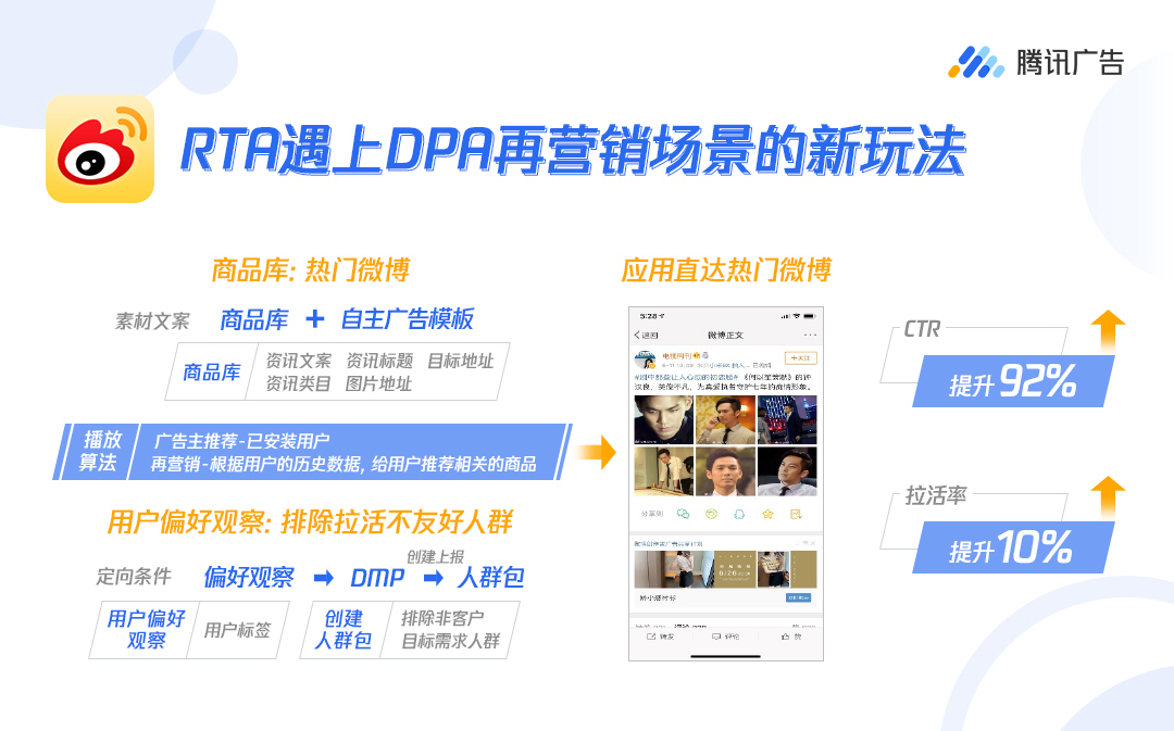 这时,DPA(商品广告)与RTA的结合,能够让再营销变得事半功倍。首先,微博会基于自身算法模型,预估CTR较高的海量广告商品,以及可能会对此感兴趣的用户群体,随后将商品信息和人群偏好洞察一并传至腾讯投放端,投放端结合这些信息,进行千人千面的商品展现,实现更加精准的投放,进而提高CTR。同时,在RTA的加持下,有效排除重复点击人群。最终实现点击率提升92%,拉活率提升10%。