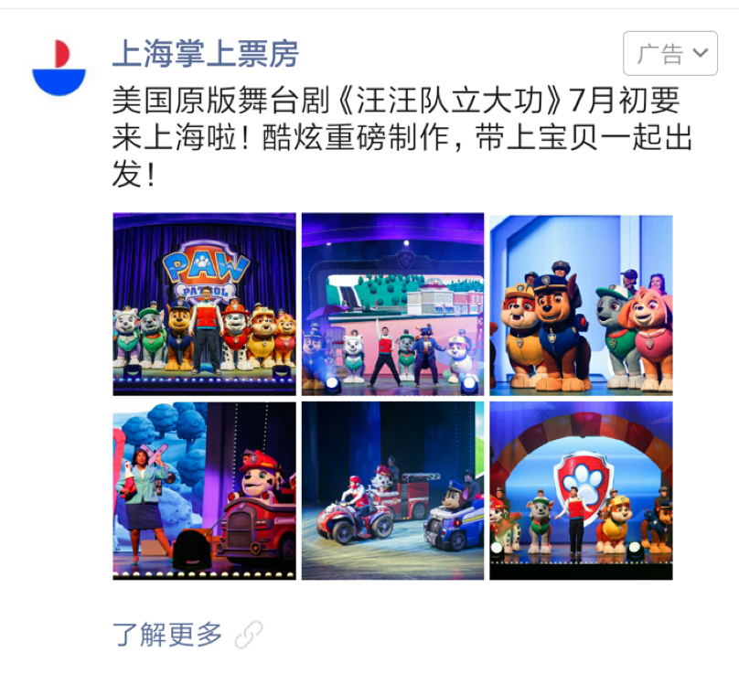 《汪汪队立大功》在上海的演出,通过朋友圈进行推广,有针对性地制定投放策略、及时跟进优化,收获了很好的投放效果。