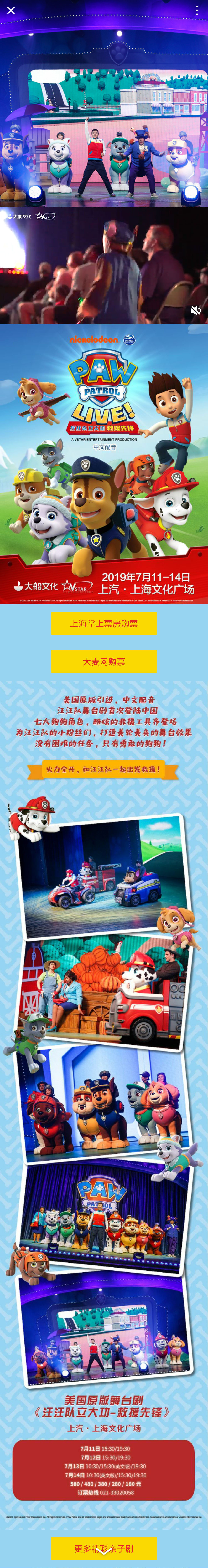 舞台剧《汪汪队立大功》,是基于从美国引进的动画片《汪汪队立大功》所改编的。在推广中利用其强大的粉丝基础,充分致敬动画角色,在外层素材上选择常规多图形式,展现精美剧照;原生推广页里通过《汪汪队立大功》演出视频和大幅海报图片,点燃粉丝观演热情。